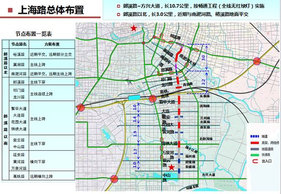 上海路暢通工程(郎溪路—方興大道)由中鐵十局承建,長10.7公里,按暢通工程(全線無紅綠燈)實施;郎溪路以北至裕溪路,長3.0公里,近期與南淝河路、裕溪路地面平交。巢湖路及南淝河大橋節點:南淝河大橋主線跨過巢湖路落地,南淝河大橋采用下承式鋼桁架橋,橋面寬40米,雙向六車道,主跨130米。該項目主題結構設計使用年限為100年,全部采用耐久性砼。