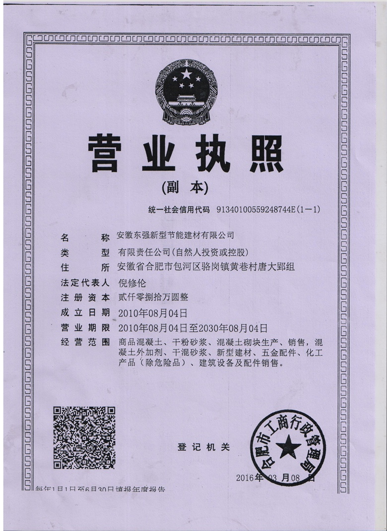 安徽東強新型節能建材有限公司 電話:0551-63489333 地址:安徽省合肥市肥東縣循環經濟示范園 龍興大道與繁華大道交叉口 傳真:0551-63460663 網址:www.szyongkang.cn